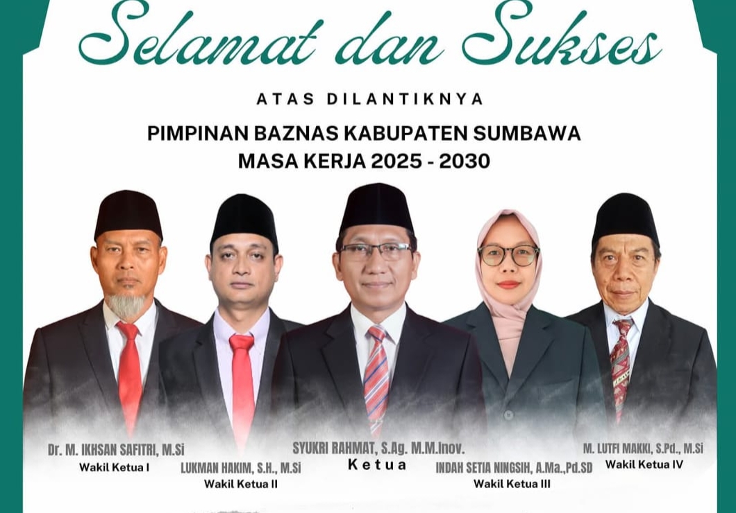 Pelantikan tersebut didasarkan pada Keputusan Bupati Sumbawa Nomor 1221 Tahun 2025 tentang Penetapan Ketua dan Wakil Ketua BAZNAS Kabupaten Sumbawa Masa Kerja 2025–2030. Adapun susunan pengurus yang dilantik yaitu Ketua: Syukri Rahmat, S.Ag., M.M.Inov; dan para Wakil Ketua: Dr. M. Ikhsan Safitri, M.Si, Lukman Hakim, SH., M.Si, Lutfi Makki, S.Pd., M.Si, serta Indah Setianingsih, A.Ma.Pd., SD.