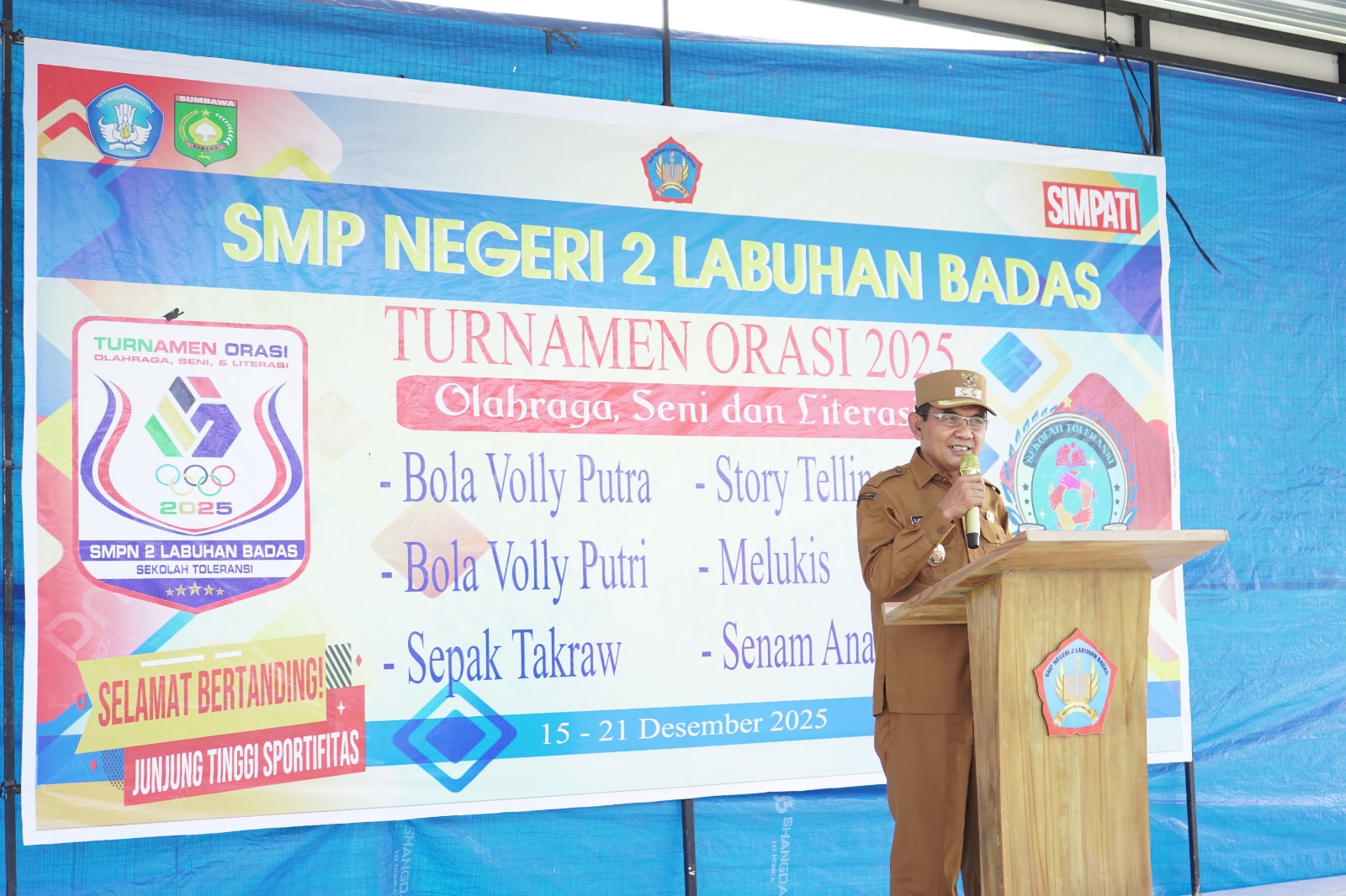 Sumbawa Besar, SakaNTB.com| 15 Desember 2025 — Wakil Bupati Sumbawa, Drs. H. Mohamad Ansori, secara resmi membuka Turnamen ORASI (Olahraga, Seni, dan Literasi) Antar Pelajar SD/MI/SMP/MTs/Sederajat Tingkat Kabupaten Sumbawa, yang dipusatkan di SMP Negeri 2 Labuhan Badas, Senin (15/12/2025).
